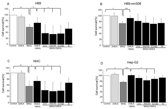 To assess the involvement of estrogen and androgen receptors in DHEA’s protection against oxidative stress induced by tBHQ, an MTT cell viability assay (3-(4,5-dimethylthiazol-2-yl)-2,5-diphenyltetrazolium bromide; Thermo Fisher, Waltham, MA, USA) was performed (see Supplementary Figure S1). To accomplish this, cells (NHC, H69, H69-miR506 and Hep-G2) were cultured in 96-well plates (10,000 cells/well). After 24 h, the cells were incubated with the following estrogen or androgen inhibitors: 12 nM of G15 (GPER), 2 nM of ICI 182,780 (ER-α), 10 nM of PHTTP (ER-β) and 2 nM of bicalutamide (androgen receptor). Two hours later, the cells were incubated with tBHQ together with DHEA. Please see the time-line scheme of experiments (Supplementary Figure S2). Cell viability was examined by measuring the reduction in yellow, water-soluble tetrazolium salt to purple, water-insoluble formazan. Data are presented as the percentage of survival relative to control conditions.