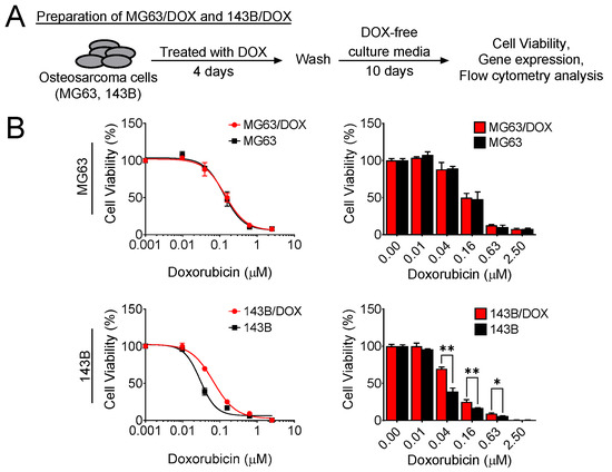Doxorubicin enhances chemoresistance in osteosarcoma cells. (A) Schematic of MG63/DOX and 143B/DOX cell preparation. (B) MG63/DOX and 143B/DOX cell viability after treatment with doxorubicin. Cells were treated with various concentrations of doxorubicin for 4 days, and then the MTS assay was performed to analyze cell viability. The data represent the means ± SD. * p < 0.05 and ** p < 0.01 vs. their parental cells.