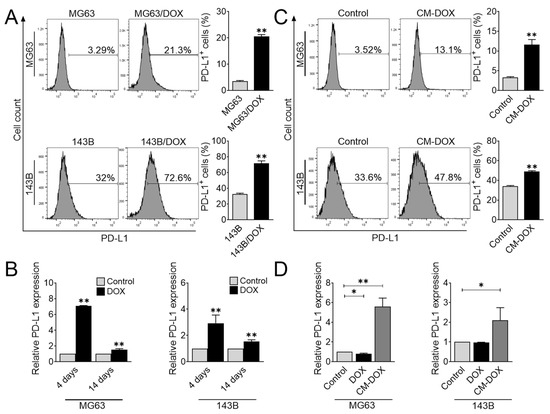 Doxorubicin accelerates PD-L1 expression in osteosarcoma cells. (A) Flow cytometric analysis of PD-L1+ osteosarcoma cells. MG63/DOX and 143B/DOX were analyzed for cell surface expression of PD-L1 using flow cytometry. The data represent the means ± SD. **, p < 0.01 vs. their parental cells. (B) PD-L1 gene expression in response to doxorubicin treatment. Osteosarcoma cells were treated with doxorubicin (40 nM) for 4 days, washed, and further cultured for an additional 10 days. The qRT-PCR was performed to evaluate PD-L1 gene expression on days 4 and 14. The data represent the means ± SD. **, p < 0.01 vs. control (0.04% DMSO). (C) Flow cytometric analysis of PD-L1+ osteosarcoma cells. MG63 and 143B cells were treated with CM-DOX for 48 h and then were analyzed for PD-L1 protein expression using flow cytometry. The data represent the means ± SD. **, p < 0.01 vs. control. (D) PD-L1 gene expression after CM-DOX treatment. Osteosarcoma cells were treated with CM-DOX or doxorubicin (40 nM) for 24 h, and qRT-PCR was performed to determine PD-L1 gene expression. The data represent the means ± SD. *, p < 0.05 and **, p < 0.01 vs. control (0.04% DMSO).