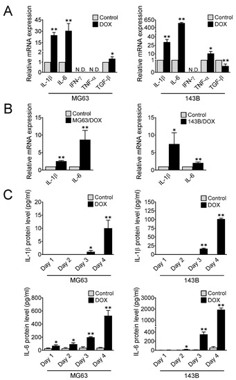 Doxorubicin enhances the expression of proinflammatory cytokines IL-1β and IL-6 in osteosarcoma. (A) Gene expression of the proinflammatory cytokines IL-1β, IL-6, IFN-γ, TNF-α, and TGF-β after doxorubicin treatment. Human osteosarcoma cells were treated with doxorubicin (40 nM) for 4 days, and qRT-PCR was performed to determine cytokine gene expression (N.D., not detected). The data represent the means ± SD. *, p < 0.05 and **, p < 0.01 vs. control (0.04% DMSO). (B) IL-1β and IL-6 gene expression in MG63 and 143B cells after doxorubicin withdrawal for 10 days. The data represent the means ± SD. *, p < 0.05 and **, p < 0.01 vs. untreated parental cells. (C) Secretion of IL-1β and IL-6 after doxorubicin treatment. Osteosarcoma cells were treated with doxorubicin (40 nM), and the culture media were collected on days 1, 2, 3, and 4 to determine the IL-1β and IL-6 levels using ELISA. The data represent the means ± SD. *, p < 0.05 and **, p < 0.01 vs. control (0.04% DMSO).