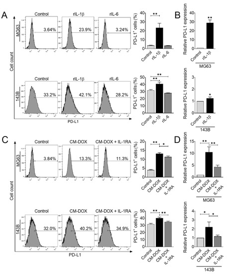 Osteosarcoma cells (1 × 105 cells) were seeded in 6-well plates and treated with CM-DOX in the presence or absence of 100 ng/mL of IL-1 receptor antagonist (IL-1RA; BioLegend, San Diego, CA, USA) for 24 h and 48 h to determine PD-L1 gene and protein expression using qRT-PCR and flow cytometry analysis, respectively. For EV treatment, osteosarcoma cells (1 × 105 cells) were treated with 100 µg/mL of EVs for 24 h in the presence or absence of 100 ng/mL of IL-1RA, and PD-L1 gene expression was determined by qRT-PCR.
