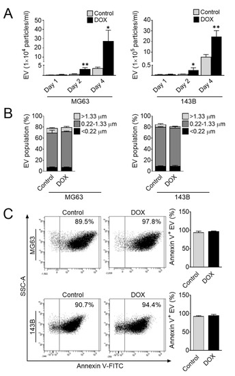 Given the extensive induction of proinflammatory cytokines IL-1β and IL-6 following doxorubicin treatment, we subsequently studied whether the generation of EVs was necessary for IL-1β and IL-6 expression. We first investigated the effect of doxorubicin on EV release in osteosarcoma cells. To this end, we treated MG63 and 143B cells with doxorubicin for 1, 2, and 4 days. At each time point, the supernatant was collected, and then the amount and size of EVs were determined by flow cytometry. We found extensive release of annexin-V-positive EVs in a time-dependent manner, and the amount of EVs following doxorubicin treatment was significantly increased compared with that in the untreated control cells (Figure 5A). Considering the size of EVs, we next estimated the size distribution of EVs in osteosarcoma cells after doxorubicin treatment. We also found that the major population of EVs secreted from these cells ranged from 0.22 to 1.33 µm, corresponding to the size of microvesicles (Figure 5B). However, no differences were observed in the size or annexin-V-positive population in both the treated and control cells (Figure 5B,C). Collectively, these observations clearly suggested that doxorubicin enhances EV release in osteosarcoma cells. Consistent with the induction of EVs, the levels of IL-1β and IL-6 were significantly increased in doxorubicin-treated culture medium (Figure 3C). These findings suggested a significant correlation between the number of EVs and the levels of proinflammatory cytokines IL-1β and IL-6.
