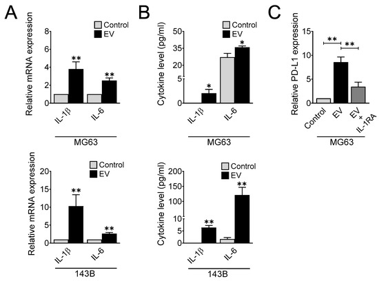 We next evaluated whether EV treatment is sufficient for modulating PD-L1 expression. To this end, we treated MG63 cells with EVs in the presence or absence of the IL-1 receptor antagonist for 1 day and determined the levels of PD-L1 gene expression. Our results revealed that EVs strongly upregulated PD-L1 expression, and cotreatment with the IL-1 receptor antagonist abolished this effect (Figure 6C). These results strongly suggested that EVs accelerate PD-L1 expression via IL-1 signaling.