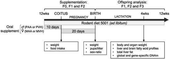 The following supporting information can be downloaded at https://www.mdpi.com/article/10.3390/cells11061057/s1, Figure S1: Growth and food intake of three-month-old founder mice supplemented with AA or VH. Figure S2: Body weight of female and male one-month-old offspring following germline or in utero FA exposure for three consecutive generations. Table S1: Fatty acid profile of the Laboratory Rodent diet 5001 and vehicle (Nutrioli® soybean oil). Table S2: FA supplementation across generations and offspring weight. Table S3: Reproductive parameters of FA-supplemented and non-supplemented three-month-old dams. Table S4: Offspring organ weight and correlation with mg of FA exposure. Table S5: Analysis of liver tissue of one-month old offspring of FA-supplemented mice. Table S6: Correlations between liver weight, total fat, and FA (individual and by degree of saturation) across three offspring generations. Table S7: Global DNAm and Scd1. Ppargc1a promoter methylation of liver from one-month-old offspring of FA supplemented mice.