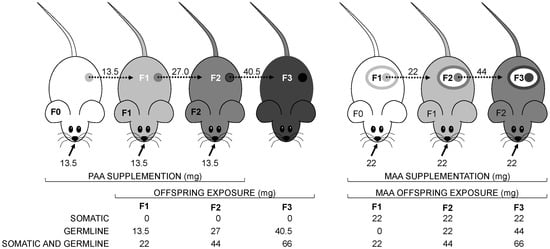 Cumulative germline and/or somatic offspring AA exposure of paternally and maternally supplemented mice. Filled arrows indicate total mg of AA supplement (calculated by multiplying mg of daily supplement by days of exposure) administered at each generation (F0, F1, and F2); dotted arrows indicate milligrams of germline or soma AA exposure (circles and ovals, respectively) of F1, F2 and F3 offspring generations. Cumulative AA exposure somatic and/or germline offspring exposure at each generation are indicated below each mouse generation. Similar calculations were performed of paternal and maternal vehicle supplements.