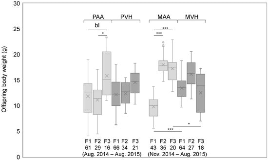 Offspring body weight of mice supplemented paternally or maternally for three consecutive generations. Horizontal lines indicate significant differences between each experimental group; bl p < 0.1, * p < 0.05, *** p < 0.001; supplemental period and n of each group is indicated under each bar graph; PAA and MAA: paternal and maternal AA supplementation, respectively; PVH and MVH: paternal and maternal VH supplementation, respectively.