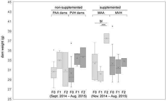 Body weight of three-month-old dams at supplemental day 1. Y-axis indicates dam body weight at supplemental day 1: day 1 of pregnancy. PAA and PVH dams: non-supplemented dams that were crossed to AA- or VH-supplemented sires. bl p < 0.1, *** p < 0.001. Other symbols are as in Figure 3.