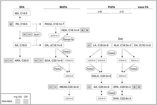 Correlations between milligrams of parental AA exposure or liver weight and offspring liver FA content. Diagram of SFA, MUFA, and PUFA biosynthesis pathways highlighting individual FA that showed significant (p < 0.05) or borderline significant (p < 0.1) correlations with both germline and germline + somatic PAA+MAA exposure (Pearson’s r). Large white boxes indicate the analyzed FA; FA in italics were not detectable. Squares with solid and dotted filling indicate significant and borderline significant correlations with AA exposure (grey) or liver weight (grey with black dots); “+” and “−“ indicate positive and negative correlations, respectively; promoter methylation was analyzed on the genes indicated in ovals; other abbreviations: SFA, MUFA, and PUFA, saturated, mono-, and polyunsaturated FA, respectively; MA, myristic acid; PA, palmitic acid; SA, stearic acid; ARA, arachidic acid; PAOA, palmitoleic acid; OA, oleic acid; ECA, eicosanoic acid; HDA, cis-7-hexadecenoic acid; LA, linoleic acid; ALA, alpha-linolenic acid; EA, elaidic acid; AA, arachidonic acid; EPA, eicosapentaenoic acid; DHA, docosahexaenoic acid; DGLA, dihomo-γ-linolenic acid; Fads2, fatty acid desaturase 2; Scd1, stearoyl-CoA desaturase 1.
