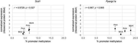 Correlations between Scd1 and Ppargc1a promoter methylation and expression of F2 offspring of AA- and VH-exposed mice. Each data point represents average normalized expression values of n = 6 mice (3 male and 3 females); Pearson’s r values are indicated in the upper left corner of each graph. Other abbreviations are as in Figure 3.