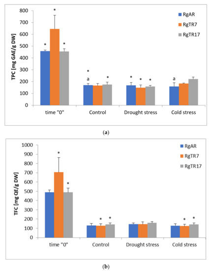 (a) Total phenolic (TPC) and (b) total flavonoid (TFC) content determined in R. graeca roots cultivated under various conditions. RgAR—anatomical roots; RgTR7—hairy root line TR7; RgTR17—hairy root line TR17; time “0”—28-day-old roots at time of inoculation; Control—roots cultivated without any treatment for 14 days; Drought stress—roots treated by drought stress for 14 days; Cold stress—roots treated by cold stress for 14 days. The same letters indicate statistically significant differences (p ≤ 0.05) in relation to control within the same root lines between treatments. Asterisks (*) indicate statistically significant differences (p ≤ 0.05) in relation to time “0” within the same root lines between treatments.