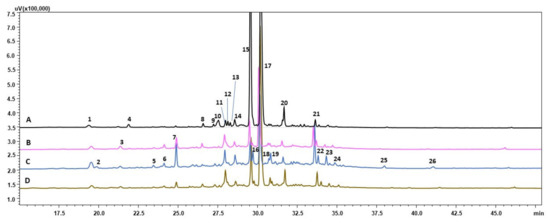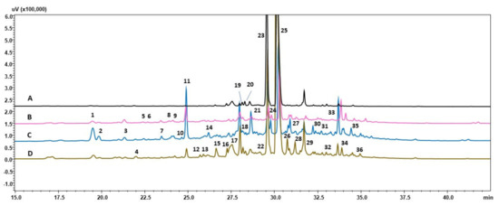 HPLC-PDA chromatograms (wavelength 320 nm) of RgTR17 line root extracts: (A) 28-day-old (time zero); (B) 14-day old untreated roots-control; (C) roots treated 14 days with drought stress; (D) roots treated 14 days with cold stress.