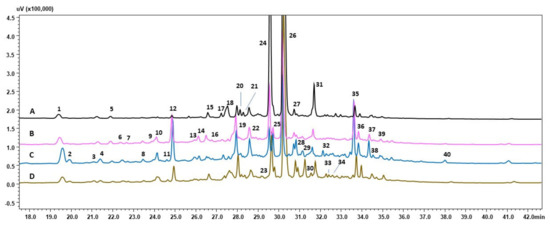HPLC-PDA chromatograms (wavelength 320 nm) of RgAR line root extracts:(A) 28-day-old (time zero); (B) 14-day old untreated roots-control; (C) roots treated 14 days with drought stress; (D) roots treated 14 days with cold stress.