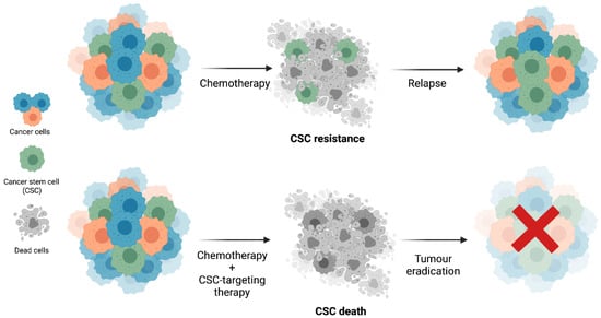 CSC resistance to conventional chemotherapy and the potential of CSC-targeting therapies for tumour eradication. The conventional chemotherapy that is currently in clinical practice targets highly proliferative cells and is ineffective against CSCs, which will ultimately be responsible for tumour relapses. The combination of standard chemotherapy with CSC-targeting therapies might be a promising strategy for tumour eradication. Biorender: https://biorender.com (accessed on 4 September 2021).