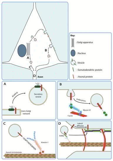 - Farías, G.G.; Guardia, C.M.; Britt, D.J.; Guo, X.; Bonifacino, J.S. Sorting of Dendritic and Axonal Vesicles at the Pre-axonal Exclusion Zone. Cell Rep. 2015, 13, 1221–1232. [Google Scholar] [CrossRef]