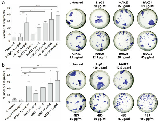 Different amounts of the recombinant antibodies were used to study dose-dependence of the monolayer dissociation. The monolayers were detached by dispase treatment. After staining with MTT, the monolayers were dissociated by mechanical stress (repeated shearing with a pipette). The data show that the recombinant antibodies hAK23 and 4B3 induced a dose-dependent fragmentation of the monolayer (Figure 2a,b). Although mAK23 and hAK23 are targeted against the same epitope in Dsg3, different amounts were required to induce the same number of fragments. This may be due to the different manufacturing processes. These antibodies are also of different subtypes, with hAK23 belonging to the IgG4 subclass, whereas mAK23 is mIgG1. For further experiments, a working concentration was chosen that gave a similar response as 75 µg/mL mAK23: 12.5 µg/mL for hAK23, and 50 µg/mL for 4B3. The control hIgGs of the matching subclasses were used at the respective concentrations.