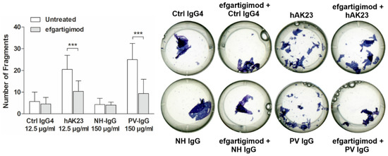Efgartigimod treatment protects keratinocyte monolayers against dissociation induced by PV IgG. hTert keratinocytes were plated on 24-well plates, grown in KGM2 medium with 0.05 mM CaCl2 until confluent, and then switched to KGM2 with 2 mM CaCl2 for 24 h. The cells were left untreated, or efgartigimod (25 µg/mL) was applied for 30 min prior to the 24 h treatment with hAK23 (12.5 µg/mL), control IgG4 (12.5 µg/mL), PV IgG (150 µg/mL) or human control IgG (150 µg/mL). Monolayer dissociation assay was performed in triplicates, and the number of fragments was quantified using ImageJ software. A representative experiment is shown. The error bars show the SD of the mean values obtained from five independent experiments. Statistical analysis was done using two-way ANOVA with Bonferroni’s post-test. Statistically significant differences are indicated by *** = p ≤ 0.001.