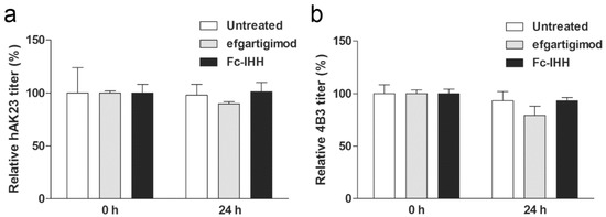 Blocking FcRn reduces the recycling of IgG and directs them towards lysosomal degradation. In our assays, this could lead to a reduced availability of the pathogenic IgG and to an apparent reduction of their pathogenic effect. To evaluate this, the amount of hAK23 and 4B3 antibodies in the medium after 24 h incubation in the cell dissociation assay was measured using anti-Dsg3 ELISA. The media of the cells treated with hAK23 or 4B3 together with efgartigimod or Fc-IHH were collected, and the antibody titers in the medium at 0 h (before applying to the cells) and after 24 h were determined by anti-Dsg3 ELISA. The amounts of hAK23 (Figure 6a) or 4B3 (Figure 6b) were not significantly changed in the medium after 24 h. In addition, efgartigimod or Fc-IHH did not induce any significant change in the hAK23 and 4B3 amount in the medium (Figure 6).