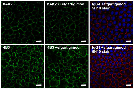 To further dissect the mechanism of the improvement of monolayer integrity by efgartigimod upon treatment with pathogenic anti-Dsg3 antibodies, hTert cells were treated for 24 h with fluorescently-coupled hAK23, 4B3 or control IgGs (Figure 7). A staining with the 5H10 anti-Dsg3 antibody and A546-coupled secondary antibody (red in Figure 7) was performed with the control IgG-treated samples after fixation to visualize Dsg3. Treatment with efgartigimod did not result in any clear improvement of the disordered Dsg3 staining pattern induced by hAK23 or 4B3 (Figure 7). The control IgG and efgartigimod treated samples show the normal linear staining pattern of Dsg3.