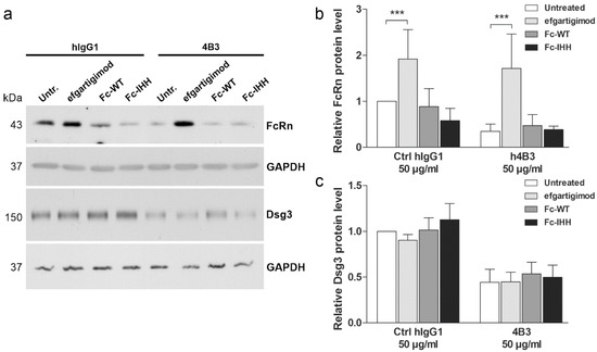 Since treatment with 4B3, but not with hAK23 or mAK23, resulted in reduction of FcRn protein level (Figure 4), the effects of efgartigimod, Fc-WT and Fc-IHH on FcRn after 4B3 or control hIgG1 treatment were studied (Figure 9). As compared to the hIgG1 treated cells, the protein levels of FcRn and Dsg3 were highly reduced after 4B3 treatment (Figure 9), consistent with the data shown in Figure 4. Efgartigimod treatment resulted in a significant rescue of FcRn level in 4B3-treated cells, whereas Fc-WT and Fc-IHH did not significantly affect FcRn protein level upon 4B3 treatment (Figure 9a,b). However, in hIgG1 treated cells, efgartigimod increased the basal FcRn protein level, whereas treatment with Fc-IHH resulted in a minor but non-significant reduction of FcRn levels. Dsg3 level, on the other hand, was not rescued by efgartigimod, Fc-WT or Fc-IHH (Figure 9c). These data show that efgartigimod may increase the protein level of FcRn in IgG antibody-treated human keratinocytes, whereas the control Fc fragments, Fc-WT and Fc-IHH, are not capable of increasing FcRn protein level.