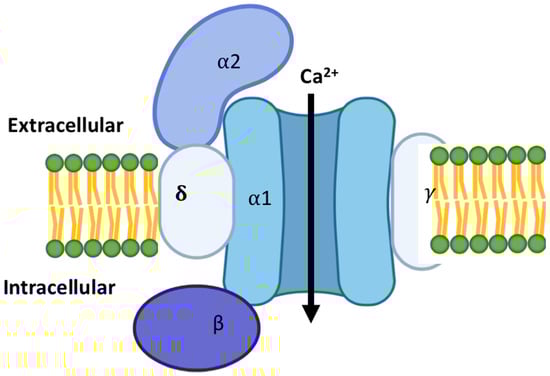 L-type calcium channels are long opening and high voltage-gated channels. They are expressed in developmental as well as adult stages in the heart [19]. They are essential and are the main source of excitation–contraction coupling as an influx of calcium occurs through them during membrane depolarization [17]. They are found not only in cardiac tissue but also in skeletal muscle and all excitable cells [20]. The L-type channels are composed of four subunits [21]. These include a pore-forming subunit, alpha (α), and three accessory subunits, beta (β), delta (δ), and gamma (γ). The α1 subunit forms the pore and central transmembrane machinery, while the β subunit is located on the cytoplasmic side of the complex and interacts with intracellular domains of the α1 subunit. The γ subunit is a transmembrane protein and also interacts with the α1 subunit, in an arrangement depicted in Figure 1 [22]. These subunits function to regulate membrane trafficking, current kinetics, and gating properties [22]. The channel is structured in four repeated domains. Each of these domains consists of six transmembrane segments, S1–S6 [6]. The S5 and S6 segments from the repeats form the pore domain. The S1 to S4 segments on each of the domains form the voltage sensor for activation or inactivation states. These channels open in response to membrane depolarization [17]. The pore-forming domain may be interrupted by extracellular loops, designated as L5 or L6 [22]. This combined with different conformations of the S5 and S6 segments creates structural variability. A selectivity filter is generated by four glutamate residues on side chains and the carbonyl oxygen atoms of the two preceding residues in each repeat. A transient depolarization in cardiac cells triggers rapid contraction, directly correlating with L-type calcium channel activity [17]. This leads to a cascade of intracellular events, one being the activation of the type 2 ryanodine receptor (RyR2) [23], resulting in a slowly developing and sustained contraction [22]. The calcium current in these channels inactivates rapidly in cardiac cells compared to aortic cells [17].