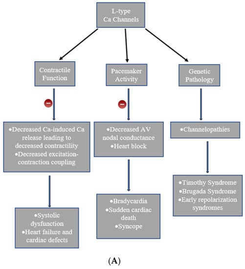 Cav1.2 contributes to a major physiological role in the contractile function of the heart. It serves as the primary channel to regulate calcium entry for excitation–contraction coupling [11]. Therefore, knockout models have been shown in the Cacna1c (which encodes Cav1.2) gene in the mouse model to lead to major cardiac defects and premature death in embryonic life [9,32]. The channel’s involvement in the cardiac pacemaker activity also results in significant bradycardia and arrhythmias in knockout models [9]. Several channelopathies have been implicated with Cav1.2.