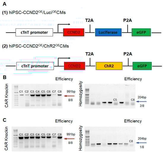 An AAVS1 cTnT donor plasmid was built upon the AAVS1-Pur-CAG-eGFR (Addgene, #80945, Watertown, MA, USA), where the CAG promoter was replaced with cTnT promoter. We then cloned CCND2, ChR2 (or Luciferase), and eGFP into the AAVS1 cTnT donor plasmid. The donor plasmid, Cas9 plasmid, and AAVS1 targeted gRNA were co-delivered to iPSCs via nucleofection. To increase cell viability, 10 μM Y27632 was used to treat hiPSCs 3–4 h before nucleofection or overnight. Cells were then singularized by Accutase for 8–10 min, and 1–2.5 × 106 hiPSCs were nucleofected with 3 μg AAVS1 gRNA T2 (Addgene, #41818, Watertown, MA, USA), 4.5 μg pCas9 GFP (Addgene, #44719, Watertown, MA, USA), and 6 μg donor plasmids in 100 μL human stem cell nucleofection solution (Lonza, #VAPH-5012, Bend, OR, USA) using program B-016 in a Nucleofector 2b. The nucleofected cells were seeded into one well of a Matrigel-coated 6-well plate in 3 mL pre-warmed mTeSR plus or mTeSR1 with 10 μM Y27632. After 24 h of incubation, the medium was changed with fresh mTeSR plus or mTeSR1 containing 5 μM Y27632, followed by a daily medium change. When cells were more than 80% confluent, drug selection was performed with 1 μg/mL puromycin for approximately 1 week, and individual clones were picked using a microscope inside a tissue culture hood and expanded for 2–5 days in each well of a 96-well plate pre-coated with Matrigel, followed by PCR genotyping. The genomic DNA of single clone-derived hiPSC was extracted by scraping cells into 40 μL QuickExtractTM DNA Extraction Solution (Epicentre, #QE09050, Middleton, WI, USA). 2×GoTaq Green Master Mix (Promega, #7123, Madison, WI, USA) was used to perform the genomic DNA PCR. For positive genotyping, the following set of primers with an annealing temperature at 65°C was used: CTGTTTCCCCTTCCCAGGCAGGTCC and TCGTCGCGGGTGGCGAGGCGCACCG. For homozygous screening, the following set of primers with an annealing temperature at 60 °C were used: CGGTTAATGTGGCTCTGGTT and GAGAGAGATGGCTCCAGGAA.