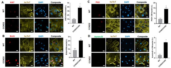 Quantification of cell cycle of CCND2 overexpressing hiPSC-CMs in vitro. The hiPSC-CCND2WTCMs (WT) and hiPSC-CCND2OE/ChR2OECMs (CCND2) were cultured for 4 weeks after the initiation of cardiomyocyte differentiation, and then immunofluorescently stained for the presence of human cTnT (hcTnT); nuclei were identified via DAPI staining. (A) Proliferation was evaluated via immunofluorescence analyses of Ki67 expression in hiPSC-CCND2WTCMs and hiPSC-CCND2OE/ChR2OECMs and quantified as the percentage of positively stained cells. Scale bar = 20 µm. (B) S-phase cells were identified via immunofluorescence analyses of Brdu incorporation in hiPSC-CCND2WTCMs and hiPSC-CCND2OE/ChR2OECMs and quantified as the percentage of positively stained cells. Scale bar = 20 µm. (C) M-phase cells were identified via analyses of PH3 expression and quantified as the percentage of positively stained cells. Scale bar = 20 µm. (D) Cells undergoing cytokinesis were identified via Aurora B expression and quantified as the percentage of positively stained cells. Scale bar = 20 µm. *—p < 0.05 versus hiPSC-CCND2WTCMs by Student’s t-test. n = 6 repeats.
