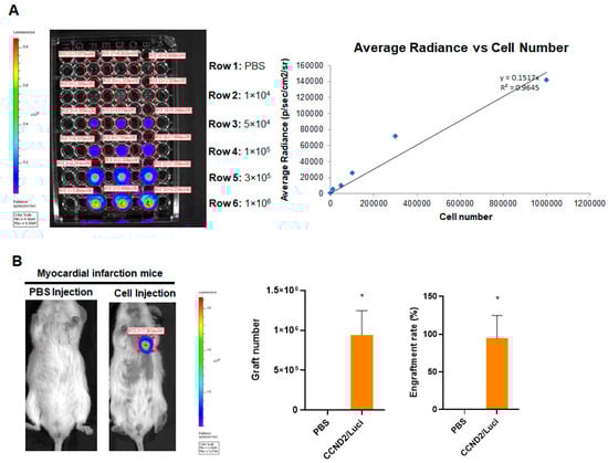 Quantification of graft size in animals receiving CCND2 overexpressing hiPSC-CMs. Immediately after surgically induced myocardial infarction, the mice received intramyocardial injection of 1 million hiPSC-CCND2OE/LuciOECMs. Control mice received intramyocardial injection of PBS after myocardial infarction induction. The transplanted cells carried a luciferase reporter plasmid and were of human origin; thus, engraftment was evaluated via bioluminescence imaging at 6 months after cell transplantation. (A) A standard curve was generated from bioluminescence measurements of known quantities of hiPSC-CMs. (B) Six months after myocardial infarction induction and treatment with intramyocardial injections of PBS (n = 6 animals) or hiPSC-CCND2OE/LuciOECMs (n = 10 animals), the mice were injected with luciferin, and bioluminescence images were collected 10 min later. Bioluminescence signal intensity was compared to the standard curve to determine the number of engrafted cells; then, the engraftment rate was calculated by dividing the number of engrafted cells by the total number of cells administered and expressed as a percentage. *—p < 0.05 versus PBS-receiving group by Student’s t-test.
