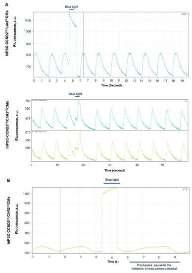 In this study, we utilized genetically engineered hiPSC-CMs that were designed to express blue-light-sensitive ChR2 cation-selective channels. To elicit an action potential in optically excitable cells, such as cardiomyocytes, the optimal number of channel proteins must become activated upon illumination with light of suitable wavelength, and the activated channels must carry sufficient photocurrent to depolarize the cell to the action potential threshold. We evaluated the function of ChR2 in hiPSC-CMs in vitro. Bright field imaging showed that blue light illumination (≥1 s, 1.6 mW/mm2) increased the beating rate of hiPSC-CCND2OE/ChR2OECMs, while turning off the light caused a delay in resuming their beating automaticity (Video S1). The same illumination protocol did not disrupt rhythmic beating in hiPSC-CCND2OE/LuciOECMs (Video S2). To determine if these light-specific responses of hiPSC-CCND2OE/ChR2OECMs are due to the changes in the electrophysiology of the hiPSC-CMs, we evaluated the calcium-transient and membrane-potential responses to blue light illumination. Our data from the optical mapping of calcium transients (Figure 4A) and voltage signals (Figure 4B) showed that blue light illumination indeed reset the automaticity of the hiPSC-CCND2OE/ChR2OECMs, but not that of hiPSC-CCND2OE/LuciOECMs. These data indicated that blue-light-induced alterations in automaticity require the presence of functional ChR2 channels.