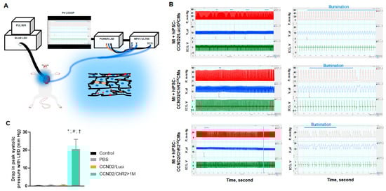 Light-induced changes of heart rhythm and left ventricle hemodynamics in mice. (A) Illustration of the optogenetic system. Red squares, ChR2 channels; red plus signs, membrane depolarization; blue ellipsoids, cardiomyocyte nuclei; orange ellipsoids, capillaries. (B) Recordings of left ventricular pressure (red), volume (blue), and electrogram (green) in anesthetized, open-chest NOD/SCID mice 6 months after permanent coronary artery ligation and intracardiac injection of hiPSC-CCND2OE/LuciOECMs (upper panels) or hiPSC-CCND2OE/ChR2OECMs before, during, and after blue light illumination (middle and lower panels). Center panels show tracings from the same animals on the left (boxed region) at expanded time scales. Horizontal blue lines indicate duration of blue light pulses. Premature ventricular complexes (PVC) were recorded with light illumination in mice receiving hiPSC-CCND2OE/ChR2OECMs. The arrhythmic effect and decline in cardiac function were mostly transient (row 2, for 3 mice), but lasted for up to 2 min (row 3, 1 mouse). X, Y labels and values are added to improve readability, (Left) LabChart Scale 500:1, (Right) Scale 20:1. (C) At the onset of PVC, reduction in systolic ventricular pressure (Pmax) was recorded. *—p < 0.05 versus sham control group; #—p < 0.05 versus PBS injection group; †—p < 0.05 versus CCND2OE/LuciOE group. n = 8 mice in sham control; n = 6 mice in PBS injection group; n = 10 mice in hiPSC-CCND2OE/LuciOECMs group; n = 10 mice in hiPSC-CCND2OE/ChR2OECMs group.