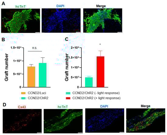 Immunohistological analysis of engrafted hiPSC-CMs. (A) Heart sections from light-responsive mice that had been sacrificed 6 months after myocardial infarction induction and treatment with PBS and hiPSC-CMs were stained for the presence of hcTnT. Nuclei were counterstained with DAPI. Scale bar = 100µm. (B,C) The engraftment rate was calculated by dividing the number of cells that expressed hcTnT by the total number of cells administered and expressed as a percentage. *—p < 0.05 versus mice receiving hiPSC-CCND2OE/ChR2OECMs but not responsive to light; Student’s t-test. n = 10 mice in hiPSC-CCND2OE/LuciOECMs group; n = 10 mice in hiPSC-CCND2OE/ChR2OECMs group (n = 6 not responsive to light and n = 4 responsive to light). n.s. indicates no significant difference. (D) Engrafted hiPSC-CCND2OE/ChR2OECMs were identified in mouse hearts at 6 months after myocardial infarction induction and cell transplantation via immunofluorescent staining for the expression of human cTnT. Both transplanted cardiomyocytes and native cardiomyocytes were stained with antibodies against Connexin-43. Images were from heart sections of light-responsive mice. Scale bar = 100 µm.