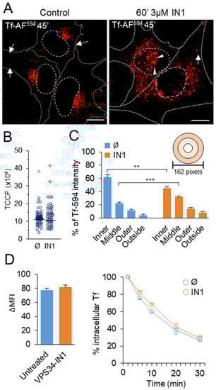 Short-term treatment with 3 μM IN1 (60 min) had no effect on Tf uptake, as confirmed by quantitative analysis of confocal images (Figure 2B), indicating that PI3P depletion does not affect endocytosis and recycling processes upstream of EEs, i.e., from APPL1-positive very early endosomes [46,47]. However, in IN1-treated cells, internalized Tf-AF594 did not concentrate in the juxtanuclear area (Figure 2A). Still, it remained in scattered perinuclear endosomes, which were vacuolized in some cells after 60 min of treatment and in most cells after longer treatment (Figure S5). In some cells, enlarged Tf-loaded endosomes accumulated below the nucleus (Figure 2A, indicated by arrowheads). The concentric circle analysis [48,49] showed the redistribution of Tf-loaded endosomes from the juxtanuclear region to the broader perinuclear area (Figure 2C). This analysis suggests that the depletion of Vps34-derived PI3P does not affect Tf uptake and transport along the EE pathway, including homotypic fusion of Tf-loaded endosomes, but likely alters endosome maturation and positioning.