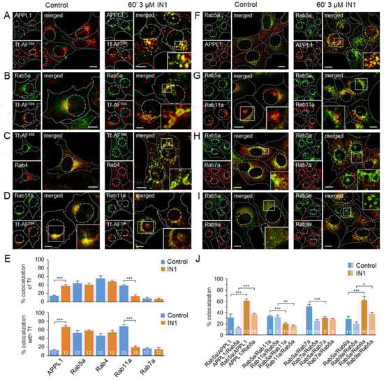 Since Rab11a can be activated at TGN-derived membranes [59,60], we also performed a colocalization analysis of Rab11a with the Golgi markers. Minimal overlap of Rab11a with GM130 and GS-15, cis and medial Golgi markers, and an expected moderate overlap of Rab11a with Vti1a and TGN38, two TGN markers, was observed in both control and IN1-treated cells (Figure S12). However, most of the peripheral Rab11a-positive endosomes, which are characteristic of PI3P-depleted cells, did not exhibit any of these TGN markers, suggesting that the peripheral Rab11a-positive endosomes are not the TGN-derived membranous organelles.