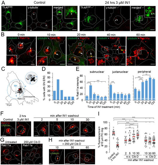 Redistribution of Rab11a-positive endosomes was reversed after IN1 washout (Figure 4F), coinciding with the recovery of PI3P and reassociation of EEA1 with EEs (Figure 1E). As early as 2 min after washout, Rab11a endosomes began to concentrate within the Ø10 μm pericentriolar circle, further concentrating around centrosomes over the next 5 and 10 min and forming the typical juxtanuclear configuration after 30 min (Figure 4F,I). Pericentriolar concentration was associated with fragmentation of peripheral Rab11a-positive endosomes, suggesting microtubule-dependent transport toward the cell center. When ciliobrevin D (Cib D) was present during ERC recovery, a cytoplasmic dynein inhibitor [58] that completely dispersed the ERC within one hour (Figure 4G), Rab11a endosomes remained fragmented outside the Ø10 µm pericentriolar area. They did not concentrate around the centrosomes (Figure 4H,I), although a small cluster of pericentriolar Rab11 endosomes was identified after 10 min (Figure 4H). These results suggest that peripheral Rab11a endosomes of PI3P-depleted cells rapidly acquire a transport capacity toward the cell center after the restoration of PI3P production.