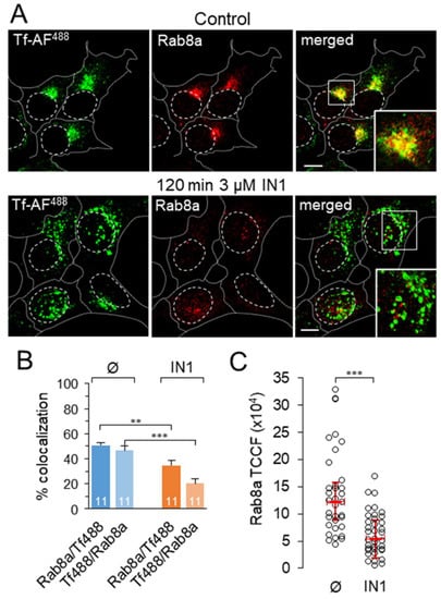 IN1 treatment depletes pericentriolar Rab8a-positive endosomes. (A) Representative images (n = 10–12) of internalized Tf-AF488 (45 min) and Rab8a in control and 120 min IN1-treated cells. (B) The 3D colocalization of TF-AF488 and Rab8a is based on the M1/M2 coefficients of pixel overlap measured across the Costes-algorithm thresholded z-stacks of confocal images. Data represent means ± SEM (number of cells indicated in bars); *** p ˂ 0.001; ** p ˂ 0.01 (two-tailed t-test). (C) Total corrected cell fluorescence (TCCF) of Rab8a in each cell was quantified using ImageJ on Otsu-thresholded confocal images. Data represent individual cells, and horizontal bars represent median value; *** p ˂ 0.001 (two-tailed t-test).