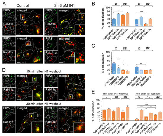 Rab11a endosomes of PI3P-depleted cells are positive for Rab11-FIP5 but not Rab11-FIP3. Representative images (A) and 3D colocalization analysis (B) of Rab11a and Rab11-FIP5 (FIP5) and Rab11-FIP3 (FIP3), in control (Ø) and 2 h IN1-treated cells (3 µM). Data represent mean ± SEM (number of cells indicated within bars) of M1/M2 coefficients of pixel overlap per cell, measured across the Costes-algorithm thresholded z-stacks of confocal images; *** p ˂ 0.001 (two-tailed t-test). (C) The 3D colocalization (M1/M2 coefficients of pixel overlap) of FIP5 with internalized Tf-AF488 (45 min internalization) and endogenous Rab5a in control (Ø) and 2 h IN1-treated cells (3 µM). Data represent mean ± SEM per cell (number of cells indicated in bars); *** p ˂ 0.001, ** p ˂ 0.01, * p ˂ 0.05 (two-tailed t-test). Representative images are presented in Figure S13. Representative images (D) and 3D colocalization analysis (E) of Rab11a and FIP5 or FIP3 in 2 h IN1-treated cells (3 µM) after 10 and 30 min of IN1 washout. Data represent mean ± SEM of M1/M2 coefficients of pixel overlap per cell (n = 8–11); *** p ˂ 0.001, ** p ˂ 0.01 (two-tailed t-test). The insets present zoomed area box. Cell borders are indicated by fine dotted lines and cell nuclei by fine dashed lines. Bars, 10 μm.