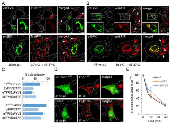 Given that pharmacological PI3P depletion has shown a change in EE maturation toward the ERC, we examined whether a similar effect can be induced by overexpression of PI3P-binding modules (EGFP-2xFYVE and YFP-p40PX) that sequester endosomal PI3P, thereby showing dominant-negative effects [34,65]. We either labeled cell surface TfRs with Tf-AF555 (Figure 8A) or anti-TfR mAb (Figure 8B) at 4 °C and analyzed them after 45 min of internalization at 37 °C or used the Tf-AF555 feeding protocol (Figure S14) to visualize the recycling circuit in 2xFYVE and p40PX expressing cells. Analysis of transfected cell samples allowed the simultaneous monitoring of the TfR pathway in transfected and untransfected cells (Figure 8, cells without green fluorescence). As a control, we used constructs expressing p40PXR57Q and 2xFYVEC215S modules with a mutation in the PI3P binding sites, as well as vectors expressing EGFP or YFP alone.