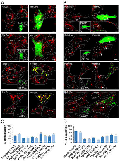Colocalization of EGFP-2xFYVE and YFP-PX with Rab5a and Rab11a. (A,B) Balb 3T3 cells were transfected with either EGFP-MSCV, EGFP-2xFYVEC215S-MSCV (C215S), EGFP-2xFYVE-MSCV, or YFP-p40PX-MSCV for 48 h. Fixed and permeabilized cells were stained with rabbit Abs against Rab5a (A) and Rab11a (B) and secondary anti-rabbit AF594. Arrows point to peripheral Rab11a endosomes in 2xFYVE and p40PX expressing cells, and arrowheads point to the juxtanuclear and subnuclear ERCs. Cell borders are indicated by fine dotted lines and nuclei by fine dashed lines. Bars, 10 μm. (C,D) The 3D colocalization of Rab5a, Rab11a, APPL1, Vps35, and Rab9a with EGFP-2xFYVE (C) and YFP-p40PX (D) based on the M1/M2 coefficients of pixel overlap measured across the Costes-algorithm thresholded z-stacks of confocal images. Data are means ± SEM per cell (number of cells indicated in bars).