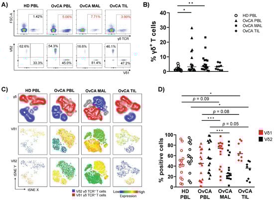 To investigate T cell subsets in three different tumor-related compartments, we compared the frequency of γδ T cells, and the ratio of Vδ1 and Vδ2 T cells in PBLs, MALs, and TILs from patients with OvCA. In addition, PBLs were compared between patients with OvCA and age-matched HDs. For gating strategy, see Figure S1A and Figure 1A. The percentage of total γδ T cells within CD3+ T lymphocytes was significantly higher in PBLs and MALs from OvCA patients than in PBLs of HDs (p = 0.017, p = 0.005; Figure 1A,B). Some of the patients showed exceedingly high frequencies of up to 30% γδ T cells. The percentage of γδ T cells was positively correlated in OvCA patients in both PBLs with MALs as well as PBLs with TILs (r = 0.80 with p = 0.0002; and r = 0.73 with p = 0.03, respectively). No difference in percentages of γδ T cells was found between TILs and PBLs of HDs.