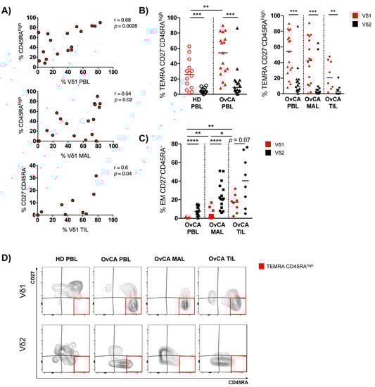 We further examined the CD45RA status (CD45RAhigh vs. low) within the TEMRAs of Vδ1 and Vδ2 cells. Differentiation into the TEMRA CD45RAhigh phenotype was positively correlated with the prevalence of Vδ1 T cells in the PBLs and MALs (Figure 2A), but not in TILs from OvCA patients. In addition, this subset of TEMRA CD45RAhigh cells was significantly increased in the Vδ1 PBLs from OvCA patients (but not within the Vδ2 subset) in comparison to Vδ1 PBLs of HDs (p = 0.009; Figure 2B). We also observed an increased fraction of these cells within the Vδ1 MALs and TILs, although this terminal differentiation status was less prominent in TILs in comparison to PBLs and MALs (Figure 2B). Instead, while the EM fraction was relatively low within the Vδ1 PBLs and MALs, their proportion was significantly higher in the TILs (Figure 2C). Furthermore, the differentiation into the EM CD27−CD45RA− phenotype was positively correlated with infiltration of Vδ1 T cells in the TILs of OvCA patients (Figure 2A). In summary, the increased frequency of Vδ1 cells in OvCA had a variable phenotype depending on the different tissues.