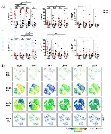 TIGIT, PD-1, CD39, and Ox40 emerge as co-regulatory receptors of interest in OvCA tissues and are preferentially expressed on Vδ1 T cells. The surface expression of TIGIT, PD-1, TIM-3, CD39, CD73, and Ox40 was compared between Vδ1 (red) and Vδ2 (black) T cells in HD PBL (open circles, n = 14), and OvCA PBL (triangles, n = 17), MAL (squares, n = 16), and TIL (diamonds, n = 8). (A) Summary data present the frequency of co-regulatory receptor (CRR)+ cells in Vδ1 and Vδ2 T cells. p-values were obtained by the Mann–Whitney test and Wilcoxon matched-pairs signed-rank test. * p < 0.05, ** p < 0.01, *** p < 0.001, **** p < 0.0001. (B) tSNE analysis illustrates the distribution of CRR+ T cells in the PBL from n = 4 HD (first row), and PBL (second row), MAL (third row) and TIL (fourth row) from n = 4 OvCA patients, respectively.