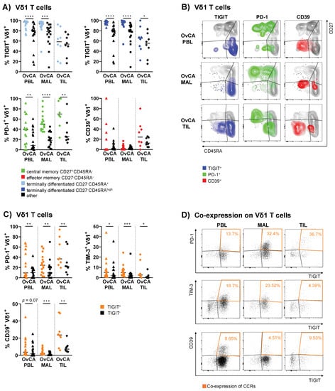 To summarize, our data showed that the expression of TIGIT, PD-1, and CD39 was generally associated with specific maturation stages of the Vδ1 T cells in OvCA.