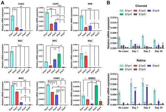 Expression of S1PR in various ocular cells. (A) Total RNA was extracted from murine ChEC, ChPC, RPE, REC, RPC, RAC, MGC, ChMC, and BMMC or (B) retina and choroid/RPE tissue, as outlined in Methods. A total of 1 µg of total RNA was used for cDNA synthesis. cDNA was used as the template for qPCR performed in triplicates of three biological replicates using specific gene primers (Table 1). The RpL13A was used as a control. The relative amounts of transcripts were determined, as detailed in Methods. * p < 0.05; ** p < 0.01, *** p < 0.001, **** p < 0.0001. (n = 3).
