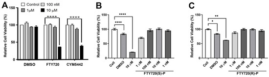 The S1PR non-selective agonist FTY720 and the S1PR1 selective agonist CYM5442 impact ChEC viability. (A) ChECs were grown in 96-well plates and incubated with medium containing varying concentrations of FTY720 or CYM5442 (in DMSO) or DMSO for 4 days. (B,C) ChECs were also incubated with different concentrations of active (FTY720(S)-P) or inactive (FTY720(R)-P) FTY720 enantiomers for 2 days. The percent cell viability relative to control samples was determined as described in Methods. * p < 0.05; ** p < 0.01, **** p < 0.0001. (n = 3).