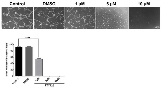 Capillary morphogenesis is an inherent characteristic of ECs necessary during normal vascular development and pathological neovascularization. To assess ChEC capillary morphogenesis, either with or without S1PR agonized by FTY720, ChECs were plated on Matrigel-coated plates for 14 h and imaged as previously reported [25,26]. FTY720 was very effective at preventing capillary morphogenesis. At 1 µM, incubation with FTY720 had a significant reduction in capillary morphogenesis. No visible capillary morphogenesis was noted with 5 and 10 µM FTY720 (Figure 5). We next assessed whether the phosphorylated FTY720 enantiomer could effectively inhibit capillary morphogenesis. Figure 6 demonstrates that 1 µM FTY720(S)-P effectively inhibits capillary morphogenesis. Thus, our data indicate an important role for S1PR activity in ChEC capillary morphogenesis.