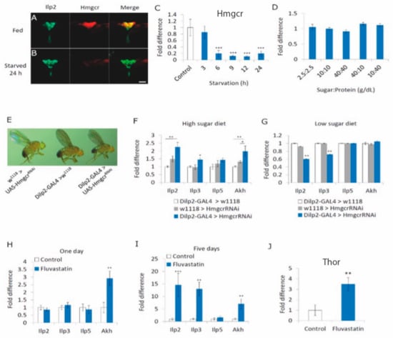 Hmgcr expression in the insulin-producing cells is regulated by starvation. (A,B) Immunohistochemical staining of brains from either equally aged (A) normal fed or (B) 24 h starved Drosophila adult males (5–7 days old). Insulin-like peptide 2 (ILP2) (green) and β-galactosidase in an Hmgcr expression pattern (red); yellow indicates overlapping expression (A,B): n = 10 males per parameter, size bar = 50 µm). (C) To examine how starvation affects Hmgcr transcript levels, RNA was extracted from whole flies fed a high-sugar diet, as well as after various times of starvation. (D) To examine how the nutritional state affects Hmgcr transcript levels, RNA was extracted from equally aged 5–7 day old male heads under different nutritional states. (C,D): Flies fed normal food ad libitum were set as 100%, represented by 1 on the graphs. n = 10 replicates, each replicate consisted of 25 male fly heads. To detect the significant difference between groups a Shapiro–Wilk test was performed to determine normality, then a one-way ANOVA with Tukey’s post hoc test for multiple comparisons was performed, *** p < 0.005). (E) Equally aged controls (w1118 > HmgcrRNAi, Dilp2-GAL4 > w1118) or where Hgmcr is knocked down in the pars intercerebralis IPCs (Dilp2-GAL4 > HmgcrRNAi), showing that the Hmgcr males are smaller than equally aged control flies. This experiment was repeated five times, with each replicate consisting of 10 males (5–7 days old) per genotype. (F) Equally aged controls and Hmgcr males maintained on a high-sugar diet (58 g/dL sugar:12 g/dL protein) were collected and processed for qPCR. (G) Equally aged controls and Hmgcr males, 5–7 days old, maintained on a low-sugar diet (10 g/dL sugar:10 g/dL protein) were collected and processed for qPCR. (H) Wild-type male flies were fed 0.5 mM fluvastatin for 24 h before being processed for qPCR. (I) Wild-type male flies were fed 0.5 mM fluvastatin for 5 days before being processed for qPCR (F–I): n = 10 replicates per genotype, with 25 fly heads per replicate for Ilp2, Ilp3, and Ilp5, or 10 bodies per replicate for Akh. To detect the significant difference between groups, a Shapiro–Wilk test was performed to determine normality, then a one-way ANOVA with Tukey’s post hoc test for multiple comparisons was performed, * p < 0.05, ** p < 0.01). (J) Wild-type male flies were fed 0.5 mM fluvastatin for 24 h before being processed for qPCR (n = 10 replicates per genotype, with 10 bodies per replicate for Thor). In all graphs, error bars = SEM.