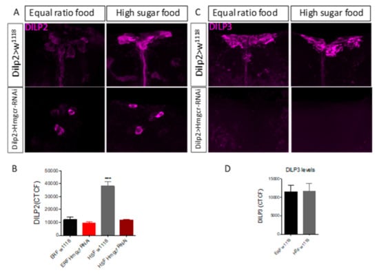 Loss of Hmgcr expression in the IPCs affects ILP protein levels. (A,B) In 5–7 day old control male flies (Dilp2-GAL4 > w1118), the high-sugar diet (58 g/dL sugar:12 g/dL protein) increased DILP2 protein levels in the pars intercerebralis IPCs compared to equally aged male flies fed a low-sugar diet (10 g/dL sugar:10 g/dL protein). In equally aged 5–7 day old Hmgcr males (Dilp2-GAL4 > UAS-HmgcrRNAi) on either diet, DILP2 protein is expressed in only a few pars intercerebralis IPCs. (C,D) DILP3 protein expression was not affected by either diet in 5–7 day old control male flies, but DILP3 protein was abolished in an equally aged experimental group (Dilp2-GAL4 > UAS-HmgcrRNAi) under both conditions. (B,D) CTCF: corrected total cell fluorescence. In all experiments n = 10 male fly heads per genotype per parameter, 5–7 days old. To detect the significant difference between groups a Shapiro–Wilk test was performed to determine normality, then a one-way ANOVA with Tukey’s post hoc test for multiple comparisons was performed, *** p < 0.005. In both graphs, error bars = SEM.