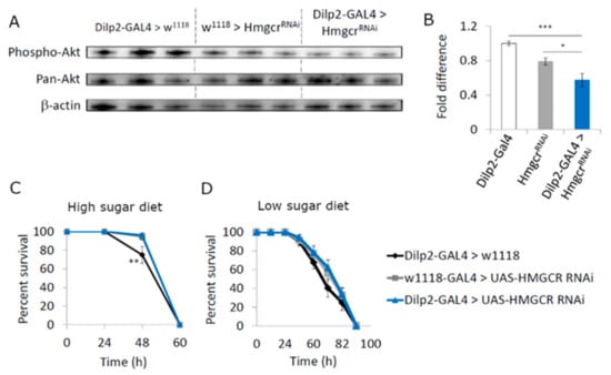Hmgcr in the insulin-producing cells regulates Drosophila insulin signaling. (A) Western blot analysis to determine phospho-AKT levels in heads of equally aged adult males (Controls: Dilp2-GAL4 > w1118 and w1118 > UAS-HmgcrRNAi; Experimental: Dilp2-GAL4 > UAS-HmgcrRNAi) maintained on a high-sugar diet (58 g/dL sugar:12 g/dL protein), aged 5–7 days post-eclosion. (B) Analysis of phospho-AKT levels compared to pan-AKT (total) present in heads of adult males (Controls: Dilp2-GAL4 > w1118 and w1118 > UAS-HmgcrRNAi; Experimental: Dilp2-GAL4 > UAS-HmgcrRNAi) raised on a high-sugar diet 58 g/dL sugar:12 g/dL protein, aged 5–7 days post-eclosion (A and B: n = 10 males per genotype, 5–7 day old. The experiment was repeated five times. In (B), statistical analysis between groups involved a Shapiro–Wilk test to determine normality, then a one-way ANOVA with Tukey’s post hoc test for multiple comparisons was performed, * p < 0.05, ** p < 0.05, *** p < 0.005. Error bars = SEM. (C,D) Equally aged adult males (Controls: Dilp2-GAL4 > w1118 and w1118 > UAS-HmgcrRNAi; Experimental: Dilp2-GAL4 > UAS-HmgcrRNAi) raised on either a (C) high-sugar (58 g/dL sugar:12 g/dL protein) or (D) low-sugar diet (10 g/dL sugar:10 g/dL protein), aged 5–7 days post-eclosion, were maintained on food containing 20 mM paraquat to determine their survival rate (n = 10 flies per genotype per replicate, with five replicates per experiment, the experiment was repeated five times).