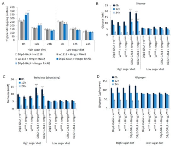 Considering that insulin signaling regulates triglyceride and carbohydrate levels in Drosophila [], we measured their concentrations before and during starvation in adult flies maintained on either a high-sugar or low-sugar diet. Hmgcr males maintained on a high-sugar diet or fed a high-sugar diet and then starved for 12 h, had significantly increased triglyceride concentrations compared to controls (Figure 4A). On the other hand, Hmgcr males maintained on a low-sugar diet had significantly lower triglyceride concentrations than controls when fed ad libitum (Figure 4A). Similarly, Hmgcr males fed a high-sugar diet had elevated circulating glucose concentrations, which remained high after 12 h of starvation (Figure 4B). Again, feeding Hmgcr males a low-sugar diet rescued the phenotype (Figure 4B). Moreover, circulating trehalose concentrations were elevated prior to starvation in Hmgcr males fed a high-sugar diet, but not in Hmgcr males maintained on a low-sugar diet (Figure 4C). Glycogen concentrations were not significantly different from controls on either diet (Figure 4D).