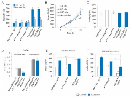 IPC Hmgcr regulates feeding in adult males (A) An intake assay [] was used to assess total food intake in equally aged 5–7 day old adult male flies, fed either a high-sugar or low-sugar diet over a 24 h period. Different letters indicate similar groups (i.e., ‘a’ is significantly different than ‘b’ or ‘c’ and so on. One-way ANOVA with Tukey’s post hoc test for multiple comparisons, p < 0.05). (B) Adult male flies, 5–7 days old, maintained on either a high-sugar diet, were fed fluvastatin-containing food for 24 h and total food intake was measured every 12 h (A,B: n = 10 replicates with 5 males per replicate. To detect the significant difference between groups, a Shapiro–Wilk test was performed to determine normality, then a one-way ANOVA with Tukey’s post hoc test for multiple comparisons was performed, * p < 0.05, ** p < 0.01). (C) A CAFE assay was used to assess total food intake in flies fed a high-sugar diet over a 24 h period in adult males where Hmgcr is specifically knocked down in the corpus allatum (Aug21-GAL4 > HmgcrRNAi) (As per standard protocols, n = 10 replicates with 5 males per replicate, per genotype. To detect the significant difference between groups a Shapiro–Wilk test was performed to determine normality, then a one-way ANOVA with Tukey’s post hoc test for multiple comparisons was performed). (D) Controls and Hmgcr males were maintained on either a high-sugar or low-sugar diet before being collected and processed for qPCR to determine tobi expression levels (n = 10 replicates per genotype, 10 whole bodies per sample for tobi. To detect the significant difference between groups, a Shapiro–Wilk test was performed to determine normality, then a one-way ANOVA with Tukey’s post hoc test for multiple comparisons was performed. *** p < 0.001). (E,F) Tobi was either € knocked down or (F) overexpressed in gut endoderm, equally aged 5–7 day old male flies were raised on a high-sugar diet with or without the Hmgcr antagonist fluvastatintin. (E) Knocking down tobi increased total food intake, this was not affected by fluvastatin, while (F) overexpressing tobi inhibited total food intake, this was rescued by feeding the files fluvastatin. (In (E,F), where present, different letters indicate a similar group. n = 10 replicates with 5 males per replicate. To detect the significant difference between groups a Shapiro–Wilk test was performed to determine normality, then a one-way ANOVA with Tukey’s post hoc test for multiple comparisons was performed, * p < 0.05, ** p < 0.01). In all figures, error bars = SEM.